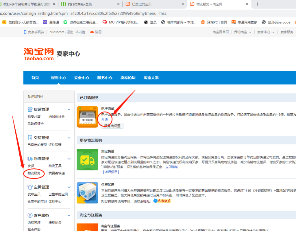 选择物流服务,开通电子面单(如有提示开店点确认即可不用上架物品)