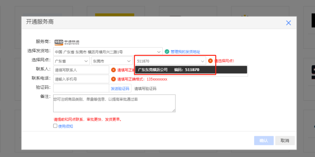 选择发货地址,如果没有默认地址,先管理添加我的发货地址再重复上面的步骤。选择网点可直接输入网点编码查询:例如我司的申通快递511870,韵达511738,圆通769063。所有信息填写完毕,点击确认提交。然后联系我司相关人员,待后台审核通过即可!
